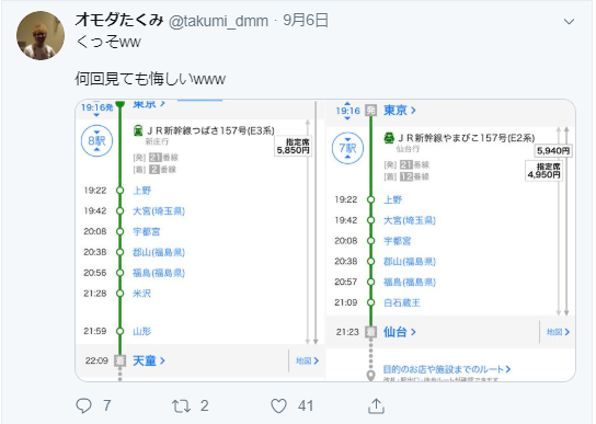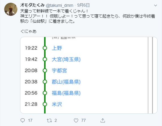 天童に向かうつもりで新幹線に乗っていたところ、仙台にたどり着いてしまったオモダたくみ(@takumi_dmm )。