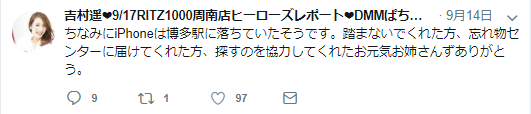 iPhoneを落とした吉村遥(@harupi1019 )。こちらは無事見つかったようで何より。