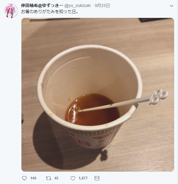 マドラー1本でカップヌードルを食べきったゆずっきー(@yu_zukizuki)。かなり器用ですね。