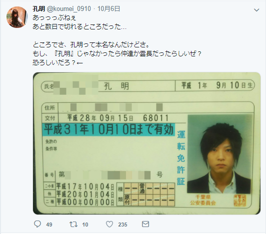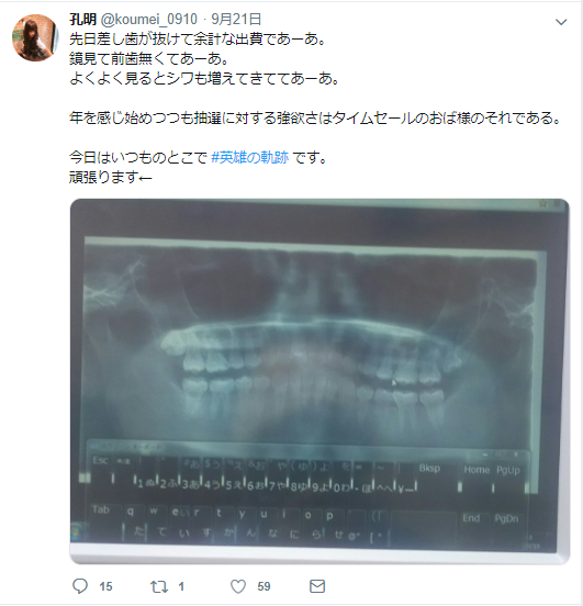 差し歯が抜けた孔明(@koumei_0910)ですが、実は本名なんです。