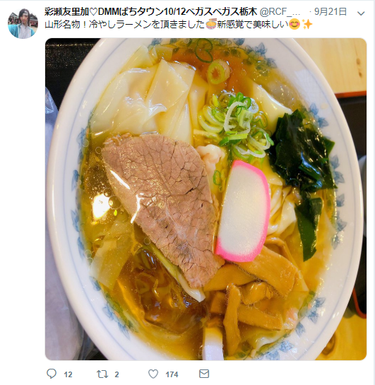 彩瀬友里加(@RCF_YuLica)の山形名物・冷やしラーメン、水木美帆(@Mizuki_Miho_)の高山ラーメンなど、各地で美味しそうなラーメンを食べています。