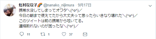 携帯を水没させて壊してしまった虹村なな子(@nanako_nijimura)。水への怒りが地獄の業火を呼び寄せたんでしょうか。