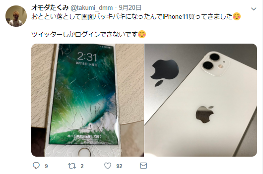 オモダたくみ(@takumi_dmm )は、スマホを落としてiPhone11に機種変更。