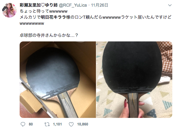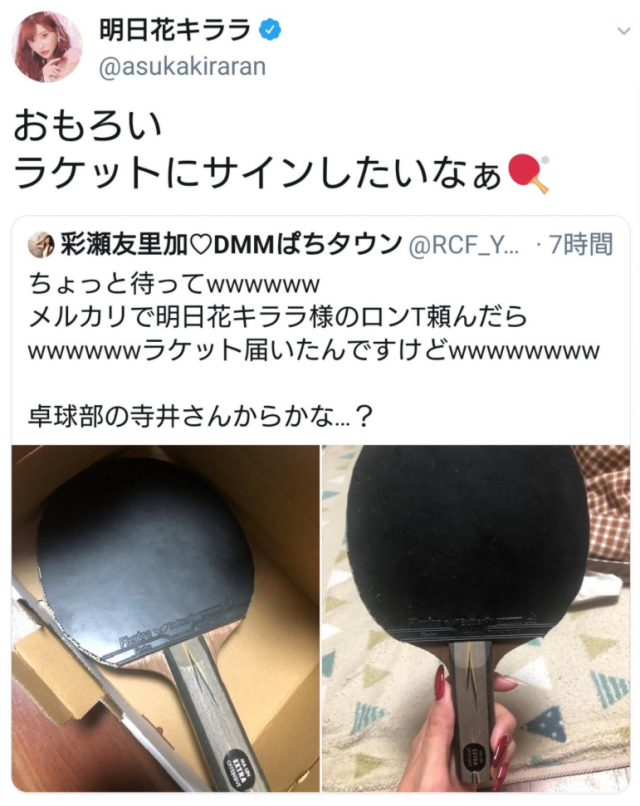 彩瀬がメルカリで明日花キララのロンTを購入したところ、卓球のラケットが届くというミラクルが発生。これだけでも事件ですが