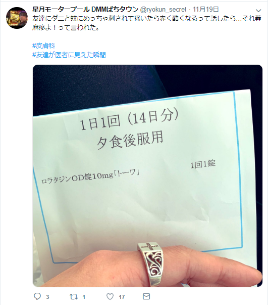 蕁麻疹になった星月モータープール(@ryokun_secret )。