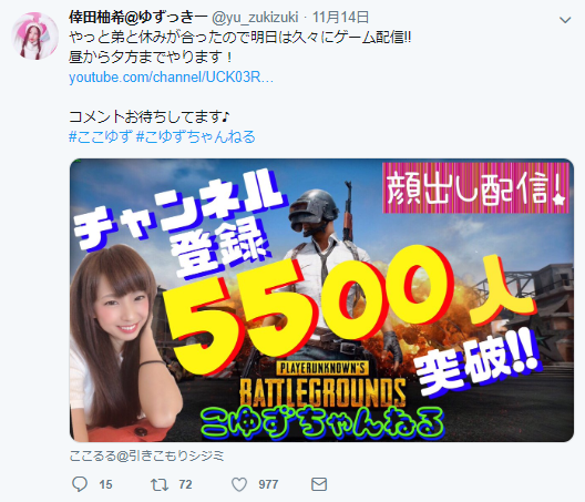 ゲーム配信のチャンネル登録者数が5500人を突破した倖田柚希(@yu_zukizuki)。